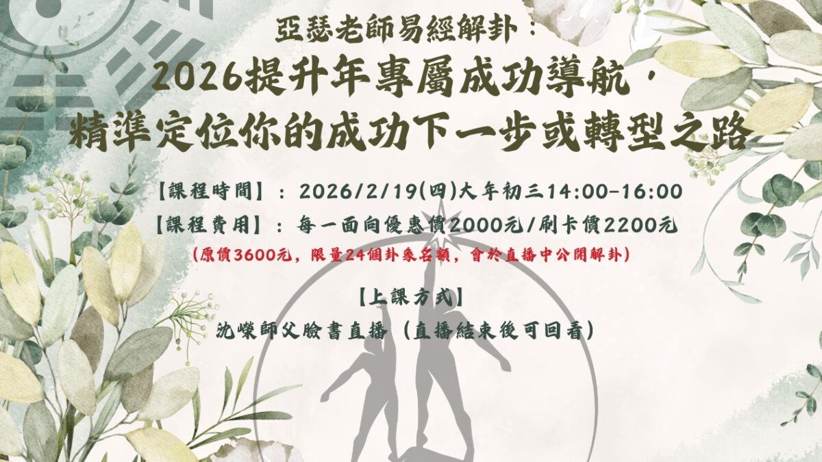 👉此時你正站在重要推進點,這堂課將幫助你集中火力,校準方向加速前進,讓原本就對的選擇與成果加倍放大,催化好結果快速顯現,人生從2026一開始就大幅抬升,邁向更高成功層級!